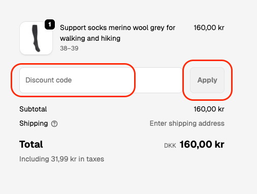 Indtast din rabatkode i feltet “Discount code”, og klik derefter på “Apply” i indkøbskurven under oversigten over varerne i din kurv. Bemærk, at rabatkoder ikke kan kombineres med andre rabatter og tilbud.