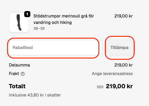 Skriv in din rabattkod i fältet "Rabattkod", klicka därefter "Tillämpa" i varukorgen under sammanställningen av varorna i din kundkorg. Observera att rabattkoder ej kan kombineras med andra rabatter och erbjudanden.